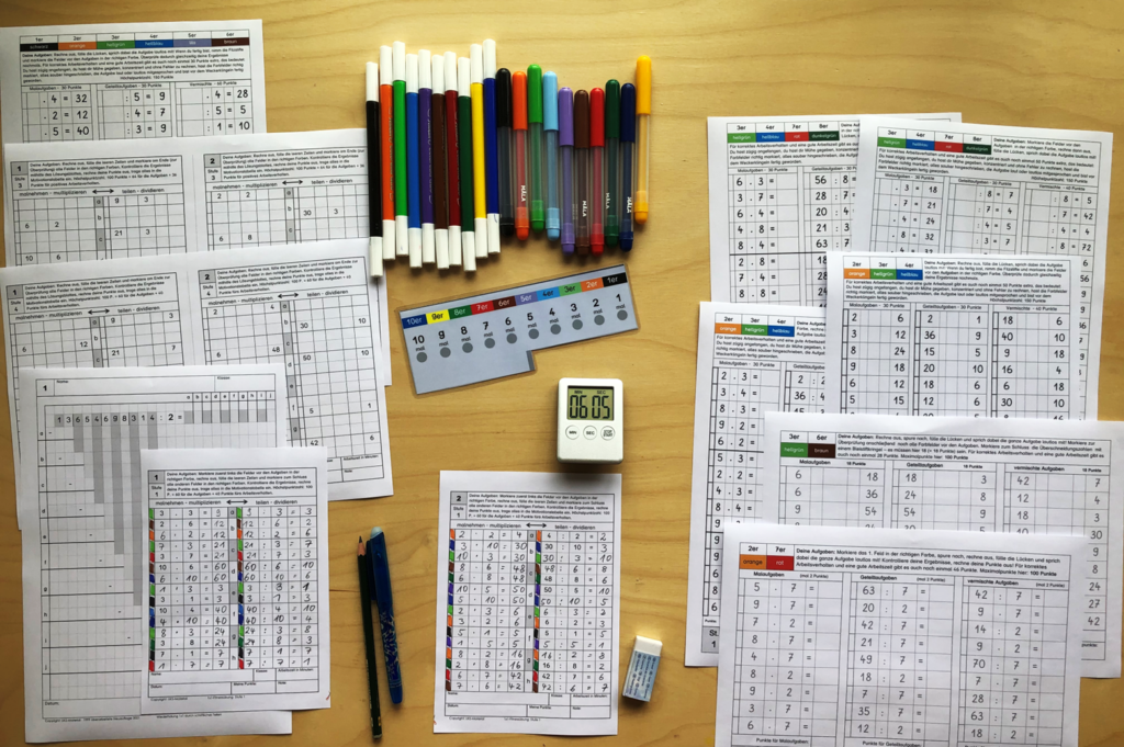 Hier Beispiele aus dem 1×1-Trainingsprogramm – angefangen mit der einprägsamen Lerngeschichte zu jeder einzelnen Malreihe bis hin zur schriftlichen Division, die auch Viertklässler verstehen können: